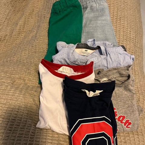 Få plagg til gutt. Penbukse fra Hust&Claire, skjorte Newbie, genser Zara. 3 bukser til barnehage og en t-skjorte følger med