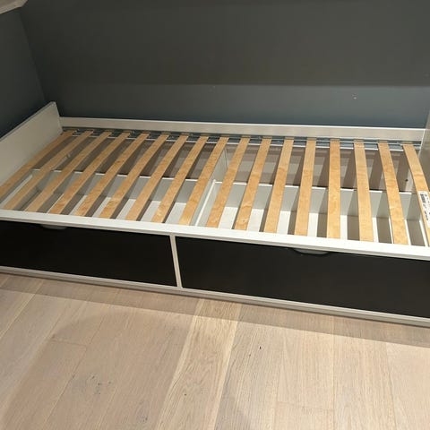 IKEA seng med skuffer under liggeflaten. Sengen har flere uttrekksskuffer som gir ekstra oppbevaringsplass til for eksempel sengetøy, klær eller leker. Passer godt på soverom eller barnerom der det er behov for både soveplass og praktisk lagring. Har en eldre justerbar sengebunn, men den kan byttes. Noen bruksmerker. Selges til førstemann som henter.