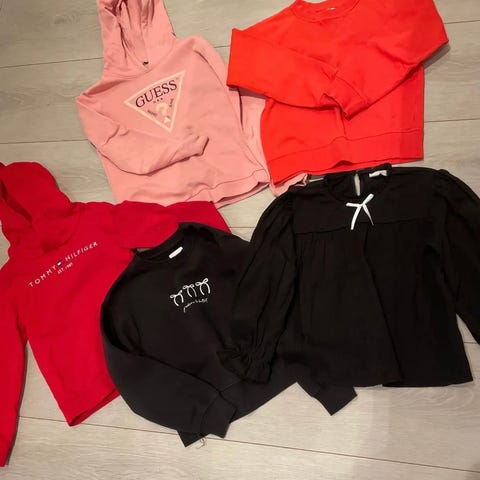 Masse klær til jente. Noe lite brukt, annet mere brukt. Hoodie fra Hummel, tracksuit Hummel, 2 bukser HM (den lyse med et lite hull), mørk jeans Levis, mørk bukse Name IT, 2 sett med bukse og genser, kjole strømpebukser, 7 pysjer, T-skjorter og langrennet tynne gensere