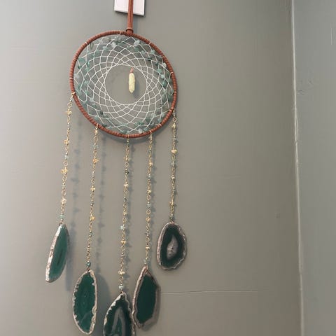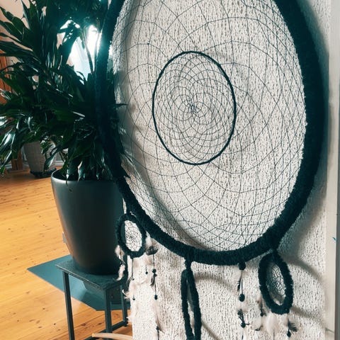 Drømmefanger med to ringer og hengende fjær i svart og brune nyanser. Ytre ring er større, med en mindre ring plassert under. Fjærene henger i flere snorer fra begge ringene og gir et dekorativt uttrykk. Passer som veggdekor i for eksempel soverom eller stue.