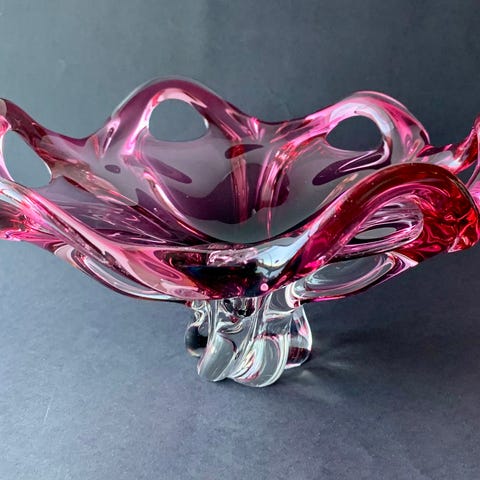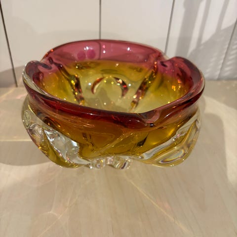 Skål i rosa og gult krystallglass, av Josef Hospodka. I utmerket stand. Som ny, foruten noen riper under stetten.