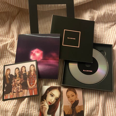 Kpop gruppa Blackpink The Album CD album i boks. Utgaven inneholder CD-plate, fotobok og flere fotokort med medlemmene. Begge photocardene er av rosé.