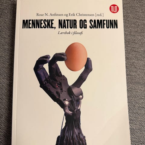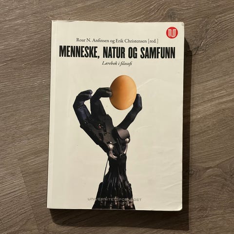 Lærebok i faget selges, da jeg er ferdig med faget 😊 «Menneske, natur og samfunn» av R.Anfinsen og E. Christensen- Universitetsforlaget. Perfekt for deg som vil lære mer om filosofi! 📖🌎
