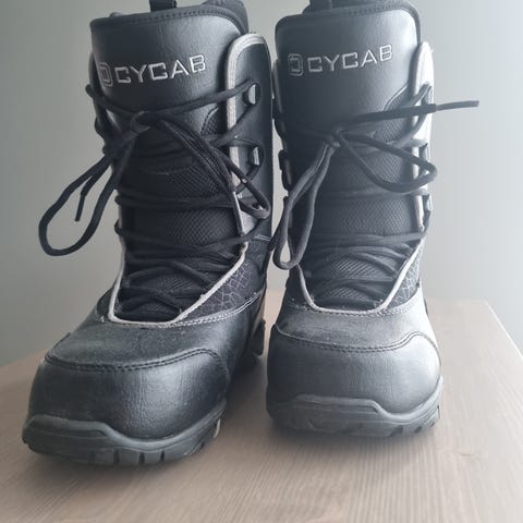 Cycab snowboardstøvler i svart farge. Modellen har tradisjonell snøring foran og forsterkede partier rundt hæl og tå. Overdelen ser ut til å være i en kombinasjon av syntetisk materiale og tekstil, med polstret skaft for bedre støtte og komfort. Støvlene har hempe bak for enklere av- og påtaking og en flat yttersåle tilpasset bruk med snowboardbindinger. Passer til bruk i alpinbakke og generelt snowboardkjøring.