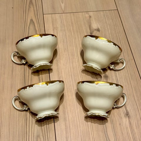En utrolig vakker kaffe- og tekopp. Hvitt porselen av høyeste kvalitet, tykt dekket med satengforgylling, ble laget av Rosenthal porselensfabrikk i 1928-29. Denne eksklusive Pompadour-modellen er preget av relieffdekorasjoner i nybarokk stil. Alle skåler har også regelmessig bølgete kanter. Kopper fra denne epoken er dekorert med dyp forgylling, noe som perfekt fremhever skjønnheten til denne porselensmodellen. Porselenet er merket underglasur med Rosenthal Selb Bavaria Pompadour-merket fra 1928 og 1929. Kopp: høyde 6,5 cm, diameter 9 cm, skål: diameter ca. 15 cm, desserttallerken: diameter 18 cm.
