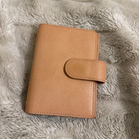 Kalender ringperm i rosa. Omslaget har seksringer i metall med gullfarge til innstikksark i personlig størrelse. Innvendig finnes flere kortlommer og en større lomme på venstre side, samt en ekstra lomme på høyre side. Lukkes med trykknappstropp. Passer til utskiftbare kalenderinnlegg og notatark i personlig format.