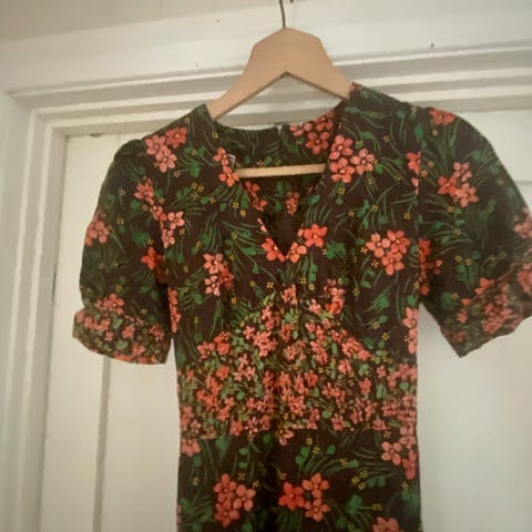 American Vintage sommerkjole for dame i størrelse S. Kjolen er flerfarget med mønster og har krage, knapper foran og trekvart lange ermer. Den er laget i bomull og har markert midje med belte og volangskjørt i kort lengde. Passer som lett sommerkjole til hverdagsbruk eller fritid.