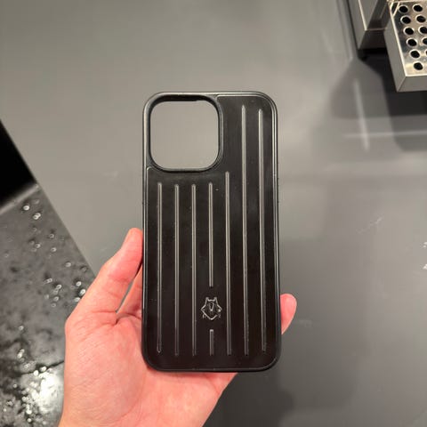 Stilrent og solid Rimowa-deksel i sort til iPhone 16 Pro Max selges. Klassisk Rimowa-design med god beskyttelse og eksklusivt preg.
