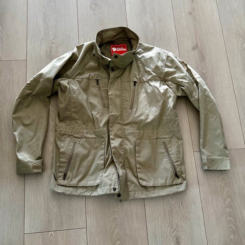 Fjällräven jakke for dame i størrelse M. Jakken er beige og laget i polyamid. Modellen har fast hette med snøring, full glidelås foran med knappestolpe og flere frontlommer med klaff. Nederst er det justering med snor. Passer som ytterjakke i hverdagen eller til tur og fritidsbruk i mildt til kjølig vær.
