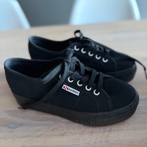 Superga sneakers/joggesko i størrelse 36. Modellen er i svart tekstil med snøring og platåsåle i gummi. Klassisk Superga-logo på siden og hælen. Egnet som hverdagssko og fritidssko. Nypris 930kr på Zalando