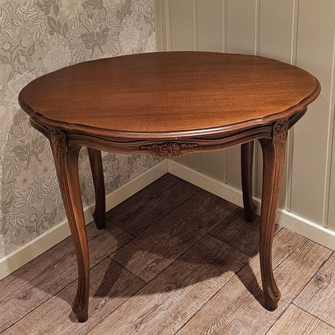 Rundt bord i teak. Pent brukt. Det har lagt en liten blondeduk oppå, mørkere farge der, kan enkelt pusses ned og oljes/lakkeres på nytt.