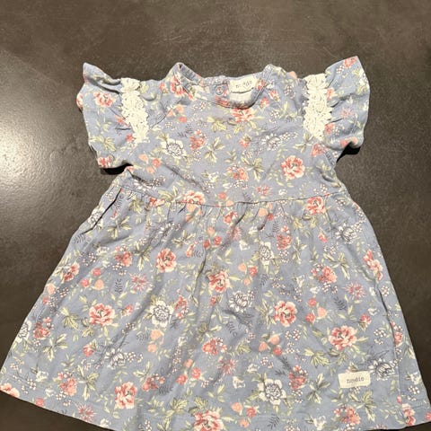 Newbie kjole for jente i størrelse 80. Kjolen er i bomull og har et flerfarget blomsterprint på lys bunn. Ermeless modell med volangkrage rundt halsen. Passer ca. 9–12 måneder, avhengig av barnet. Egnet til hverdagsbruk eller enklere pene anledninger.