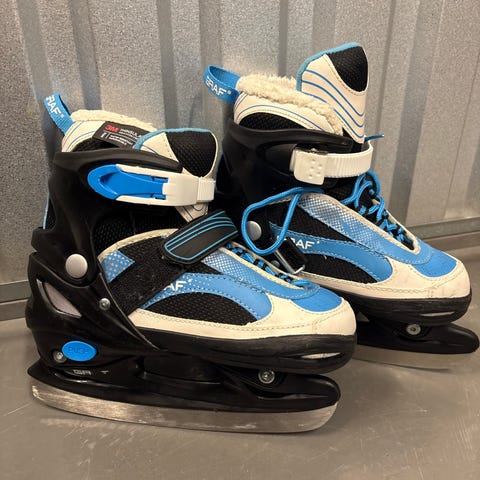 Barne skøyter med justerbar størrelse 34/37 i svart og blå farge. Skøytene har hard yttersko med spenner for god støtte rundt ankelen.