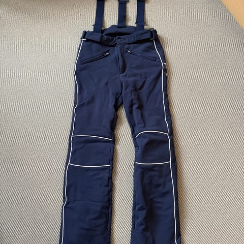 Grønn skallbukse med seler. Buksen har flere lommer med glidelås og klaff, blant annet en stor lårlomme i kontrastfarge. Justering i livet og forsterkede partier nederst på bena. Egnet som ytterbukse til ski og friluftsliv på vinteren.