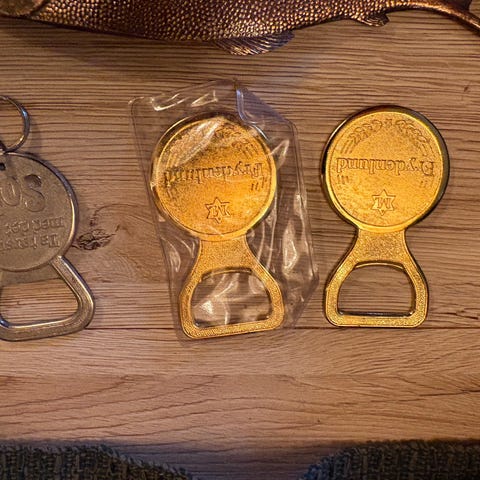 Stor, tung, flaskeåpner i messing gull og sølv belagt fra tiedemann.