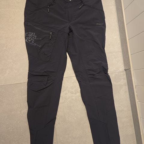 Tur- og fritidsbukse for dame i størrelse XL. Buksen er i en mørk farge og har beltehemper i livet, gylf med glidelås og knapp, samt glidelåslommer foran med kontrastdetaljer. Forsterkede felt nederst på bena og justering ved anklene. Egnet til fottur og annen utendørs aktivitet.
