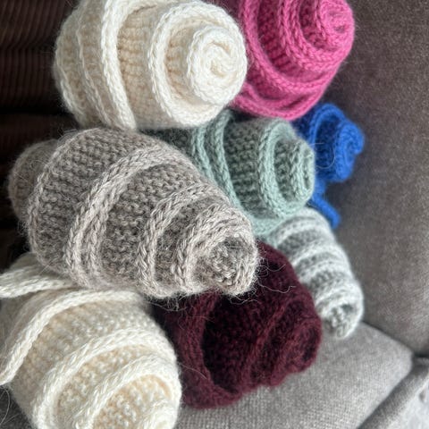 Strikket i mykt, bomullsgarn i mange forskjellige farger.