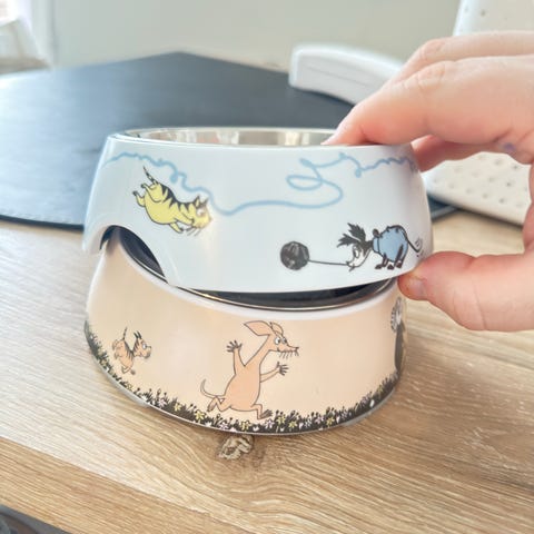 Nesten nytt sett med to stk Moomin for Pets forskåler / vannskåler og matchede Mummi silikonmatte! Matten har kant som holder gulvet rent og matskålene på plass. Skålene har avtagbar innerskål. Både skåler og underlag kan vaskes i oppvaskmaskin!