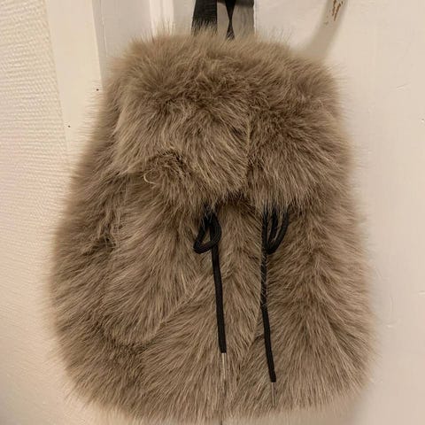 Sekk i kunstlær for dame. Sekken har fluffy pelsaktig utside i nøytral tone og glatt innside i lyst kunstlær. Lukkes med snøring og knapp øverst. Egnet som liten hverdagssekk til personlige eiendeler.