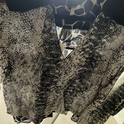 Bluse for dame i størrelse S. Blusen er flerfarget med mønster i svart og hvitt, med kontrast mellom for- og bakside. Langermet modell med v-utringning. Materiale i nylon. Passer til hverdagsbruk eller enklere penere anledninger.