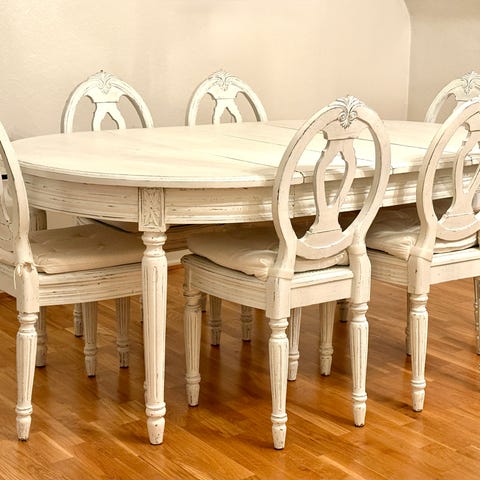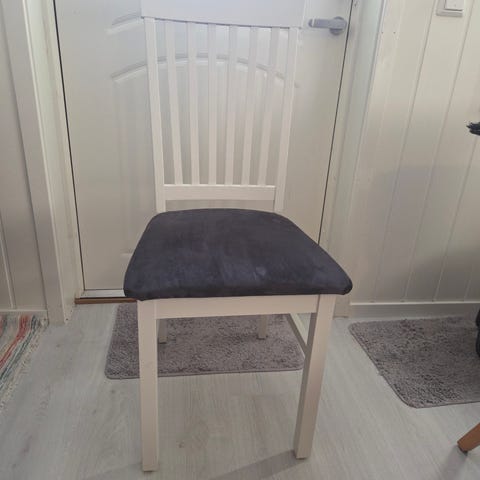 6 eldre stoler selges. Passer til bordhøyde som tilsvarer standard spisebord. Seteputene er trukket i sort, elastisk ullstoff som er varmt og behagelig å sitte på. Stolene er av stødig trevirke og kvalitet.