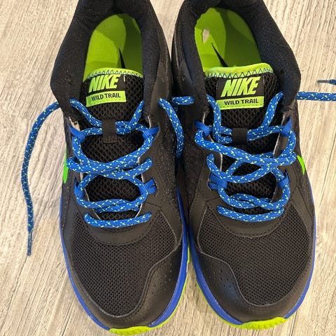 Nike løpesko i størrelse 42. Skoene har svart overdel med blå lisser og detaljer, samt oransje fôr og sålepartier. Yttersålen har mønster som gir godt grep på underlaget. Modellen er egnet som jogge- eller treningssko til allsidig bruk. Overdelen er i pustende tekstil med syntetiske forsterkninger for bedre støtte rundt foten.