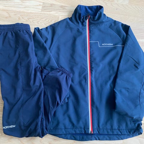 Endurance XCS løpesett for herre i størrelse S. Settet består av løpejakke og løpebukse i lett polyester.
