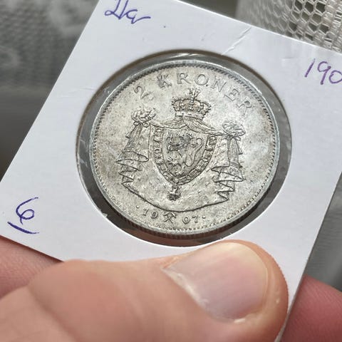 2 stk Sverige 1 krona mynt fra 1940 i sølv. Forsiden viser portrett av Gustaf V med teksten «GUSTAF V SVERIGES KONUNG» og årstallet 1940 nederst. Baksiden har riksvåpen med krone og teksten «MED FOLKET FÖR FOSTERLANDET» samt valøren «1 KR». Myntens sølvinnhold er oppgitt til 80 % Ag på omslaget. Egner seg som samleobjekt for svenske mynter og historiske myntserier.