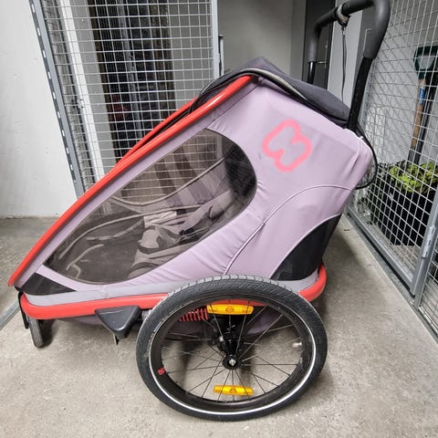 Kjekk og praktisk Vogn, sykkelvogn og pulk klar for ny eigar og nye eventyr . God plass til to barn og plass til litt bagasje til turen.