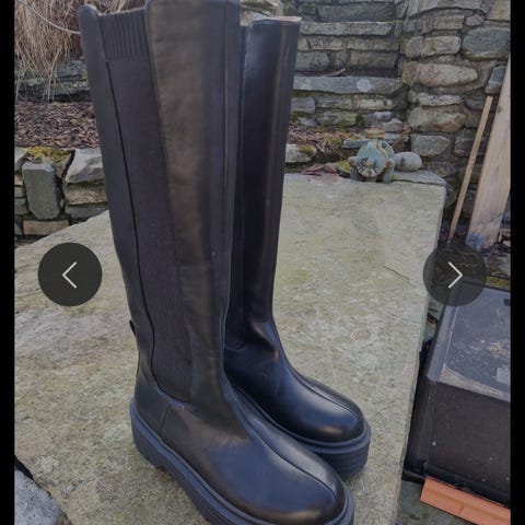 Disse sorte, høye, praktiske støvlettene med snøring forran set lekre ut til hverdags og til fintøy. De har glidelås på innsiden for at man raskt og enkelt kan ta de på seg. De er normal størrelse 39, vil jeg si.