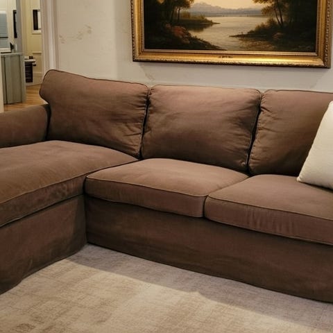 Vi har overtatt et hus og en sofa vi ikke trenger da vi har en fra før. Følger med puff som har oppbevaring. Sofaen virker veldig grei og har ingen skader. Putetrekkene kan tas av og vaskes.