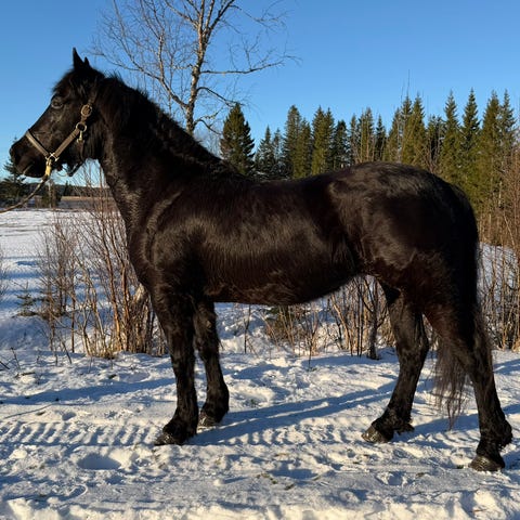 Veels netta søker muligens nytt hjem om rett hjem dukker opp. Det haster ikke med overtakelse. Hun er nær termin (månedsskifte feb/mars) og bør derfor ikke transporteres langt nå rett før fødsel. Hun ble kjøpt til bruk som kombinert hobbyhest og skolehest, noe hun i utgangspunktet passer veldig godt til. hun har imidlertid god fremdrift og er noe rask for de aller minste. Hun gjør ingenting galt, tar aldri ut, bukker, skvetter eller steiler aldri, selv med de minste på. Det er kun det at hun er en kjapp type. En veldig morsom hest for oss voksne og ungdommene, og selges derfor med svært tungt hjerte... Det er kun det at vi må kunne bruke alle hestene til alle barna her. Vi driver en veldig liten rideskole. Hun er godt innridd i skritt og trav, lystrer fint på kun sete og/eller stemme, kan fint ris i bare grime. Hun tar ting veldig lett, liker godbiter og verbal ros og kos som belønning og ønsker å jobbe for deg. Med riktig rytter er denne omskolert til dressurhest innen kort tid. Kan ikke galoppfatning enda, men lærer nå inn galoppkommando fra bakken. Hun nærmer seg som sagt fødsel, så vi lar henne bare bli mor først nå:-) Bærer seg godt, fine steg, myk og fin å ri.