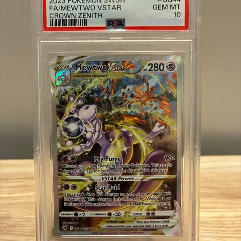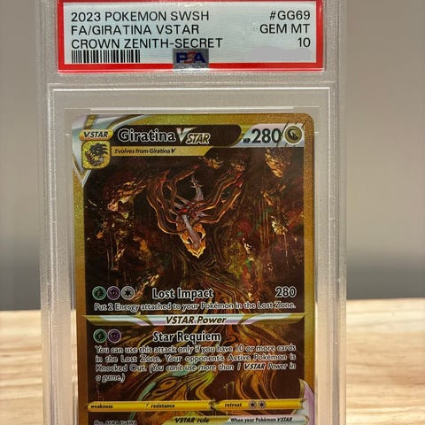Pokémon Origin Forme Dialga VSTAR samlekort fra Crown Zenith-serien. Kortet er gradert av PSA med karakteren GEM MT 10. Kortet er en Secret Rare-utgave fra Sword & Shield-serien (SWSH) 2023. Leveres i forseglet PSA-plastkapsel med etikett som viser sett, kortnummer og grad.