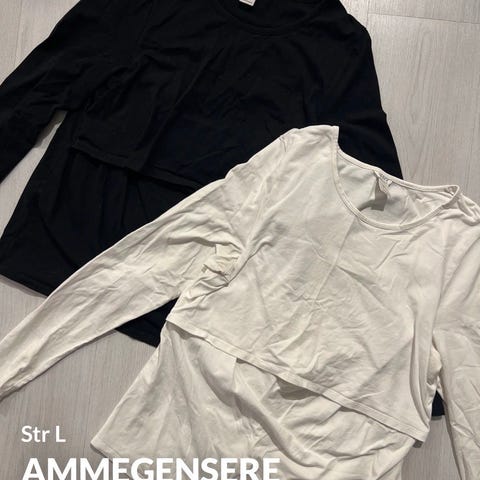 H&M amme t-skjorter i størrelse L. T-skjortene er laget i bomull og har praktisk ammeløsning med lagdelt front. Selges i to farger: svart og hvit. Passer til hverdagsbruk under ammeperioden. Den hvite er oversized og tilsvarer en XL. Den hvite er brukt 2 ganger.