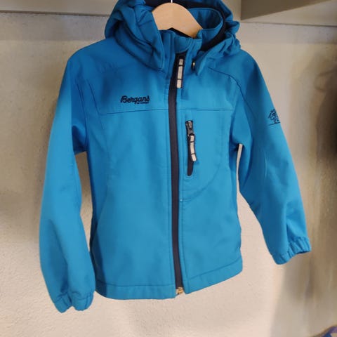 Bergans ytterjakke for barn i størrelse 98. Jakken er blå med grønne detaljer og har mykt fleecefôr på innsiden. Modellen har hette, glidelås i front og glidelåslommer.