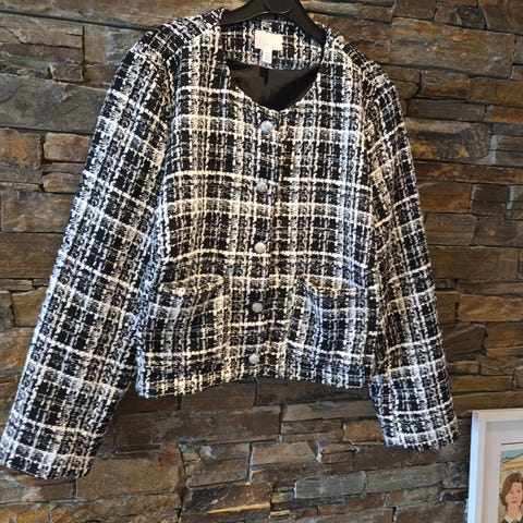 Ane Mone cardigan for dame i størrelse L. Cardiganen er laget i ull og har et flerfarget rutemønster i grå og svarte toner. Modellen har rund hals, knappelukking foran og lommedetaljer. Passer som et varmt lag over topp eller kjole til hverdagsbruk eller mer pyntede anledninger.