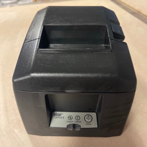 Star SP700 kvitteringsskriver i svart. Termisk matriseskriver beregnet for kvitteringer og kjøkkenboner i kassasystemer og POS-løsninger. Enheten har toppmating for papir og tilkobling for strøm via medfølgende strømadapter og kabler, slik det vises på bildene. Egnet for bruk i butikk, restaurant eller andre miljøer som trenger utskrift av kvitteringer eller ordrelapper.