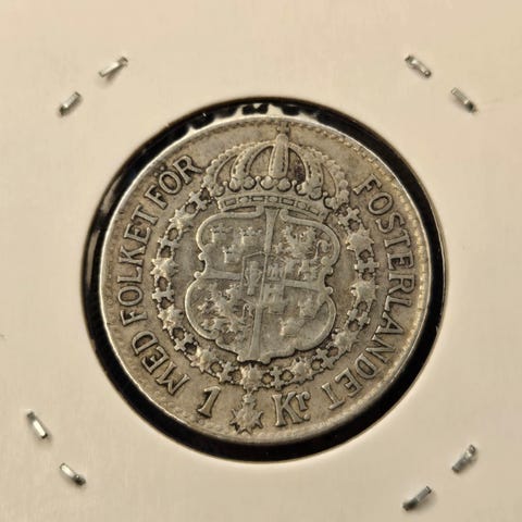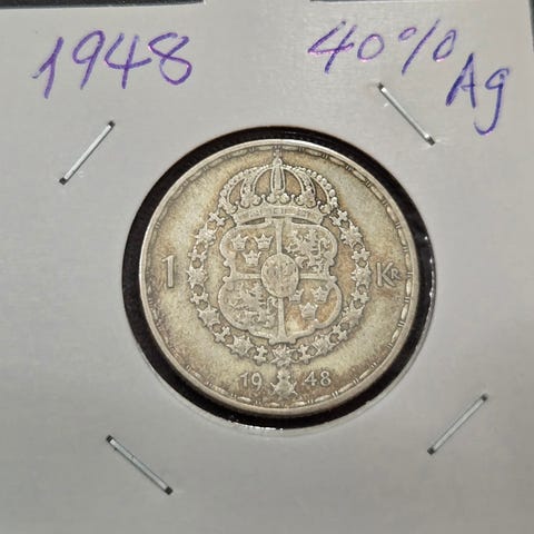 2 stk Sverige 1 krona mynt fra 1944 i sølv med angitt sølvinnhold på 40 %. Forsiden viser portrett av kong Gustaf V med teksten «GUSTAF V SVERIGES KONUNG MED FOLKET FÖR FOSTERLANDET». Baksiden har riksvåpen med krone, valør «1 Kr» og årstall 1944. Myntens opprinnelse er Sverige og valøren er 1 krona. Egnet for samlere av nordiske mynter og historiske sølvmynter.