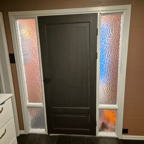 Selger en solid ytterdør fra 80-tallet med to store sidefelt som slipper inn rikelig med lys. En dør for deg som vil ha et særpreget inngangsparti til huset, eller kanskje til en garasje eller en bod.