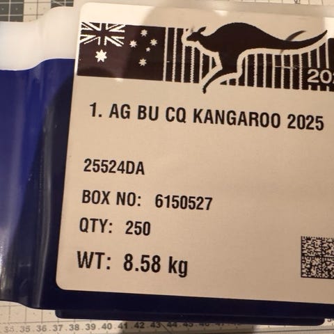 Kangaroo 2025 sølvmynter 1ozAustralia (250 stk, 8,58 kg )
