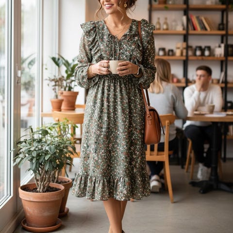 Astrid Midi Dress er en nydelig kjole fra Raus, som går like fint til hverdag som til penere anledninger. Kjolen har en flatterende midi-lengde og lange ermer, samt en markert midje med strikk bak som fremhever figuren. Den søte prestekragen med volanger og de delikate knappene i kragen gir kjolen et lekent og feminin preg. Det vakre blomstermønsteret i grønt gir et friskt og elegant uttrykk. Kjolen er laget i en viskosemiks som føles meget myk og behagelig på.