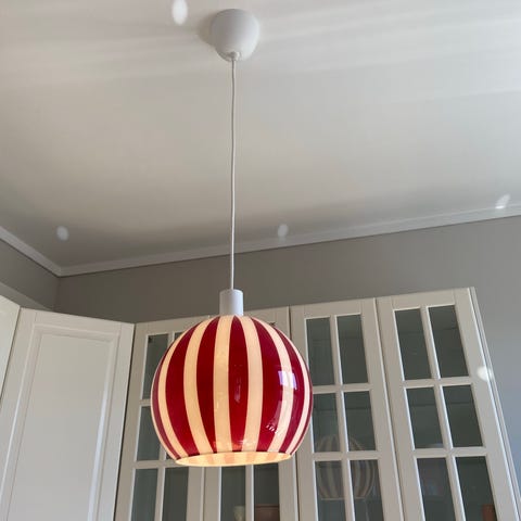 Selger en vakker vintage taklampe med hånddekorert opalglasskjerm og forkrommet metallfot. Lampen har et karakteristisk geometrisk mønster i svart og rødt, typisk for skandinavisk design fra midten av 1900‑tallet.