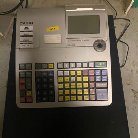 Sam4s elektronisk kassaapparat med innebygd display og numerisk tastatur. Enheten har kvitteringsskriver på toppen og flere funksjonstaster for registrering av salg. Passer til bruk i butikk, kiosk eller andre virksomheter som trenger enkel registrering av kontant- og kortsalg. Strømtilkobling via kabel. Modellbetegnelse og flere tekniske spesifikasjoner fremgår av merkingen på apparatet.