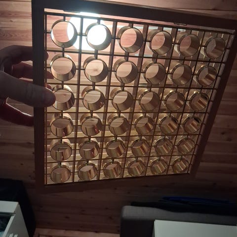 Pen taklampe fra ca 70-80 tallet i glass,metall og plast. Lyste pent før den ble pent demontert.