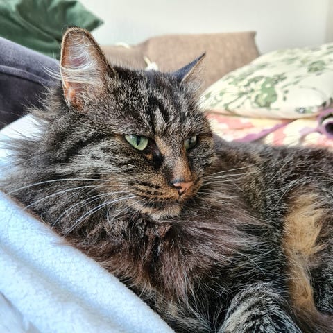 Ciela har hatt en kjempefin familie, men pga ulike omstendigheter så kom hun tilbake til oss nå før jul. Ciela er en utrolig kosete pus, veldig sosial å glad i folk! Men hun hater støvsugeren 🙈 hun er ikke redd den, hun går rett bort til den å klasker til den 😅
