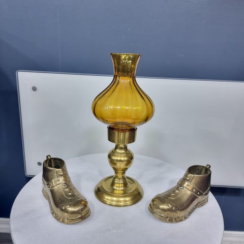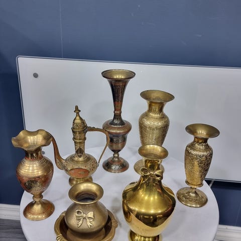 En vase og fat sett , laget av messing og fine farger , størrelse på bilder , salges for 250kr inkludert frakt eller kom med bud , kan også hentes i Sortland , har flere antikk på min profil