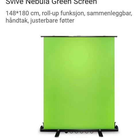 Dette er en sammenleggbar green screen (roll-up funksjon), det er håndtak for å kunne løfte den lett opp, samt at det også er justerbare føtter. Den er kjøpt på komplett.