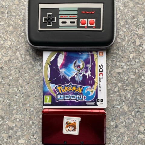 Nintendo 3DS håndholdt konsoll. Konsollen er svart og leveres med original nettadapter/lader og dokkingstasjon/ladebase. Medfølgende etui/boks med plass til konsoll, pekepenn og spillkassetter.