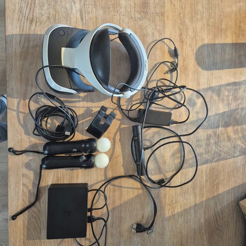 Sony PlayStation VR headset med tilhørende prosessorboks, PlayStation-kamera, strømforsyning og kabler. Headsettet er i svart og hvit utførelse og er beregnet for bruk sammen med PlayStation-konsoll (PS4-kompatibelt system). Leveres med bruksdokumentasjon som vist på bildene. Settet gir mulighet for virtuell virkelighet i støttede spill og apper på kompatibel PlayStation-konsoll. Følger ikke med originalinnpakkning