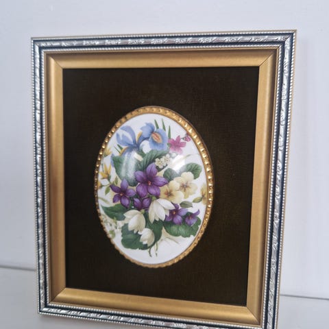 Vakkert dekorativt veggbilde med oval porselensplate i Staffordshire Fine Bone China, håndlaget i England. Klassisk blomstermotiv i myke farger, montert i elegant ramme med stoffbakgrunn.